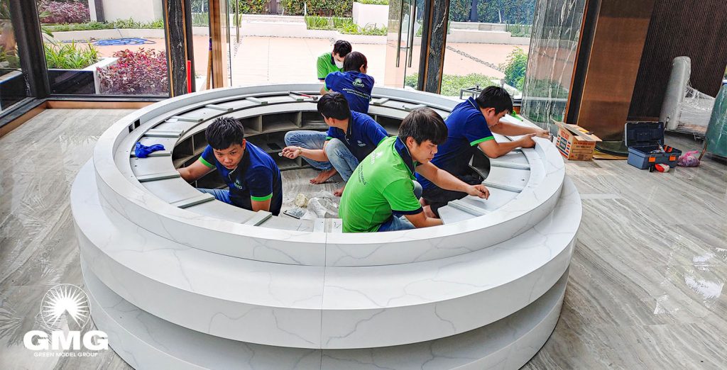 Hasco Group hiểu rằng, để đảm bảo chất lượng và tiến độ của dự án, việc lựa chọn đối tác thi công là vô cùng quan trọng. Sau quá trình sàng lọc kỹ lưỡng, Green Model Group (GMG) đã được chọn làm đối tác thi công sa bàn cho dự án. Đối với GMG, việc sản xuất sa bàn cho một dự án cao cấp như vậy là một thách thức lớn, và họ đã không ngừng nỗ lực để đảm bảo mỗi chi tiết đều đạt yêu cầu về thẩm mỹ và kỹ thuật.