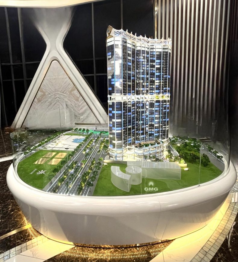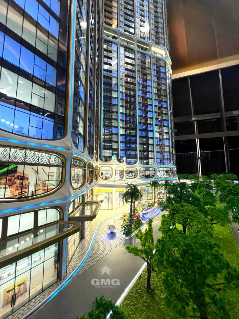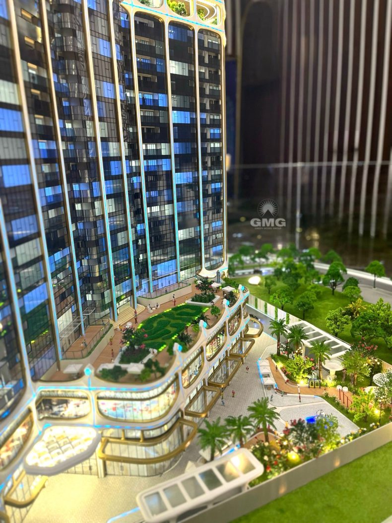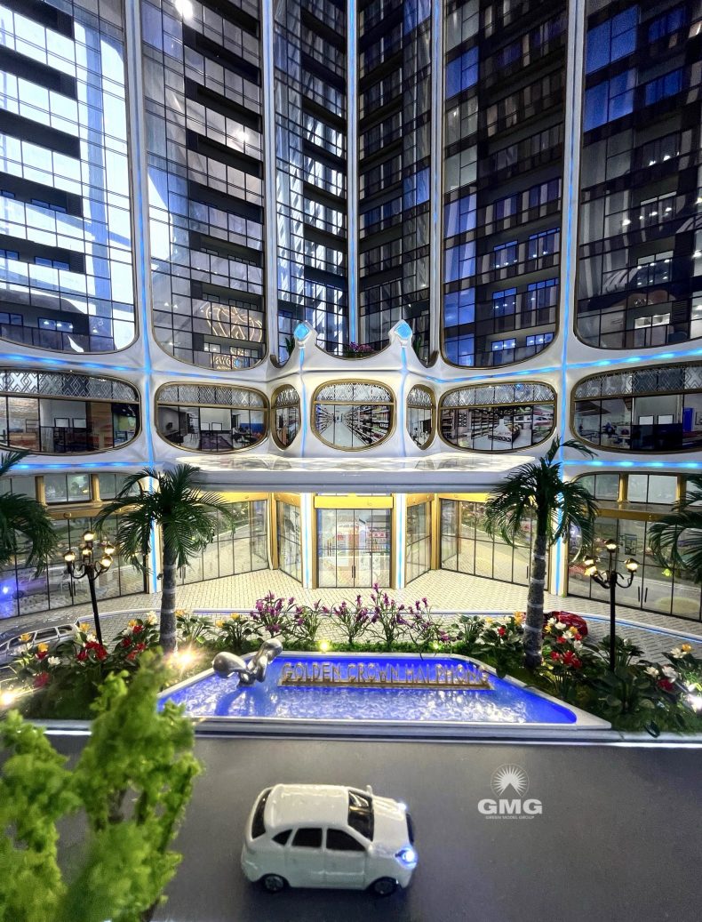 Mô hình của *Golden Crown Hai Phong* được Green Model Group chế tác bằng công nghệ tiên tiến và vật liệu cao cấp, thể hiện chính xác kiến trúc độc đáo của tòa nhà với hình dáng “vương miện vàng” sang trọng. Đặc biệt, mô hình bao gồm cả các tiện ích hiện đại như Sky Onsen, bể bơi vô cực, và vườn nhiệt đới trên cao – tất cả được tái hiện sống động, giúp khách hàng và nhà đầu tư có cái nhìn toàn diện về dự án.